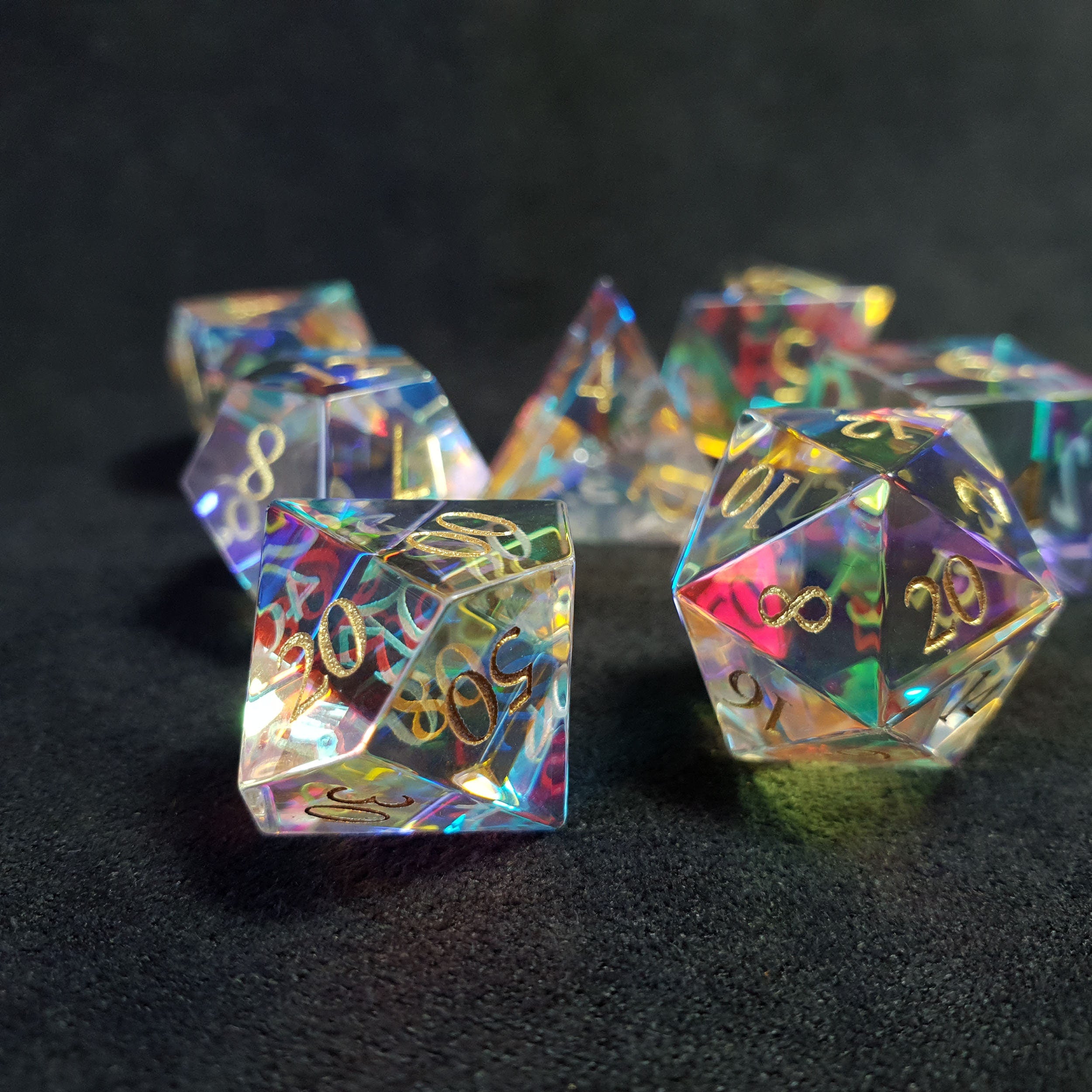Jedes der enthaltenen Sets hat je 1D4, 1D6, 1D8, 1D10, 1D%, 1D12 und 1D20.